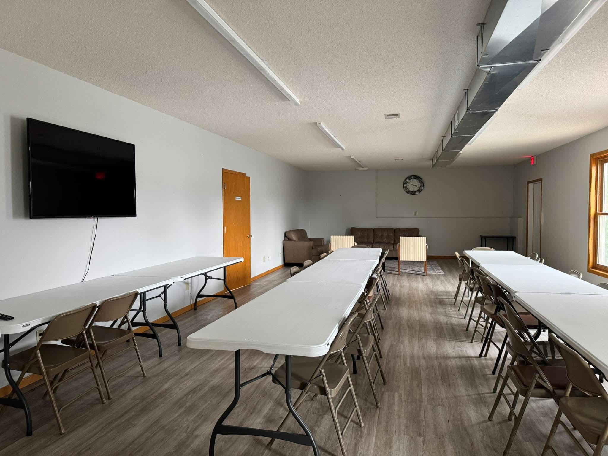 A spacious room at 19 x 51 feet, well-lit and with temperature controls independent of the main library floor. Refurbished 2017 by Friends of the Public Library.